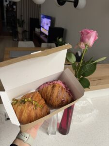 puchate croissanty z maliną i pistacją (jedzone podczas gry w Simsy)