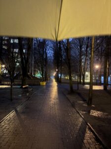 Z powiewów wiosny ukuty został na nowo zimowo-jesienny klimat. Spadł delikatny, choć uparty deszcz, z dziesięciu ciepłych stopni skok w 3, 2, 1. Zima, udaje, że już odeszła, by na nowo sprytnie wkraść się w osolone buty i lżejsze kurtki, ubrane na człowieka w nadziei, że za pierwszymi smyrgnięciami słońca dołączą przyjemne, orzeźwiające, łaskawe dni. Nic z tego, Warszawa prędko przypomniała sobie o szarości, mgłą pożarła najwyższe piętra wieżowców, wiatrem powyginała kolorowe parasolki. Kilka znalazło się w śmietnikach, kruki nieporadnie dziobią tęczowy plastik. Obok resztki niedojedzonego kebaba z Marszałkowskiej i ustawione w chaosie butelki po trunkach, jeden za drugim. Trzask. Przy chodniku zbiera się zimno i wiatr, ludzie tańczą w symfonii spieszących się taktów, jedni do metra, drudzy nad ziemię. Z n-tych pięter oglądać będą miasto, w środku przynajmniej ciepło. Nic cię tu nie przewieje.