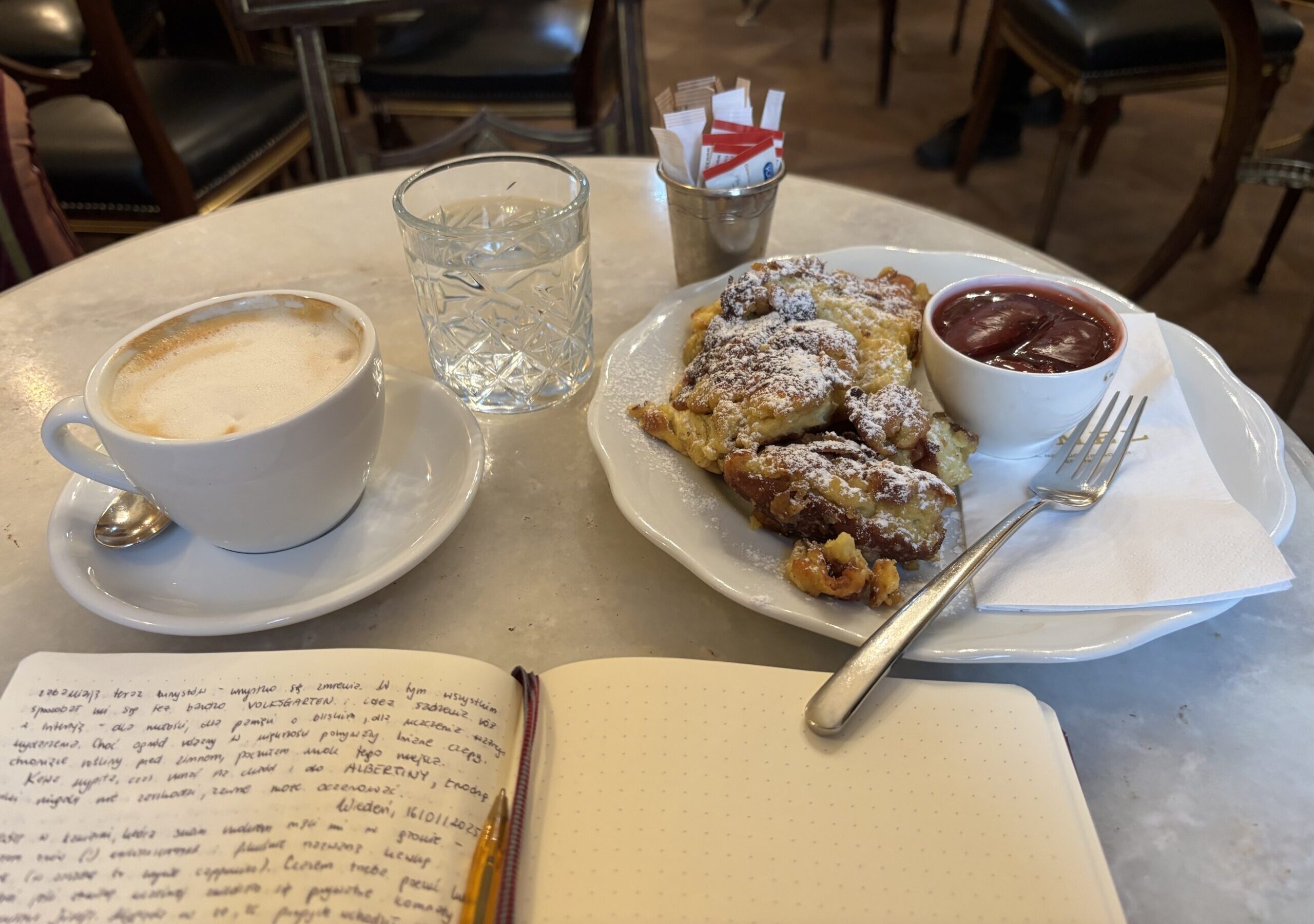 Niedaleko podziewa się z lekka luksusowa cukiernia o długich historycznych korzeniach sięgających 1786 roku. Demel zaprasza zapachem gorącej czekolady, słodkich wypieków i prostego acz zjawiskowego dania upodobanego przez samego cesarza. Kaiserschmarren – ciasto naleśnikowe potraktowane na patelni jak jajecznica, zamienia się w puchate kąski podawane z ciepłym sosem śliwkowym. Gdzieniegdzie wyłaniają się wymoczone w rumie rodzynki, całość wieńczy chmurka z cukru pudru. Dla tego przysmaku warto uciszyć oszczędne instynkty – wystarczy z rana usiąść w neobarokowej salce, domówić kawę i w spokoju przeżywać pierwsze chwile dnia. Przyjemność dla ducha sprzyja później miłej lekturze i pobudza zmarznięte ręce do szybkiego zapisywania myśli w wyślizganym bordowym notesie.